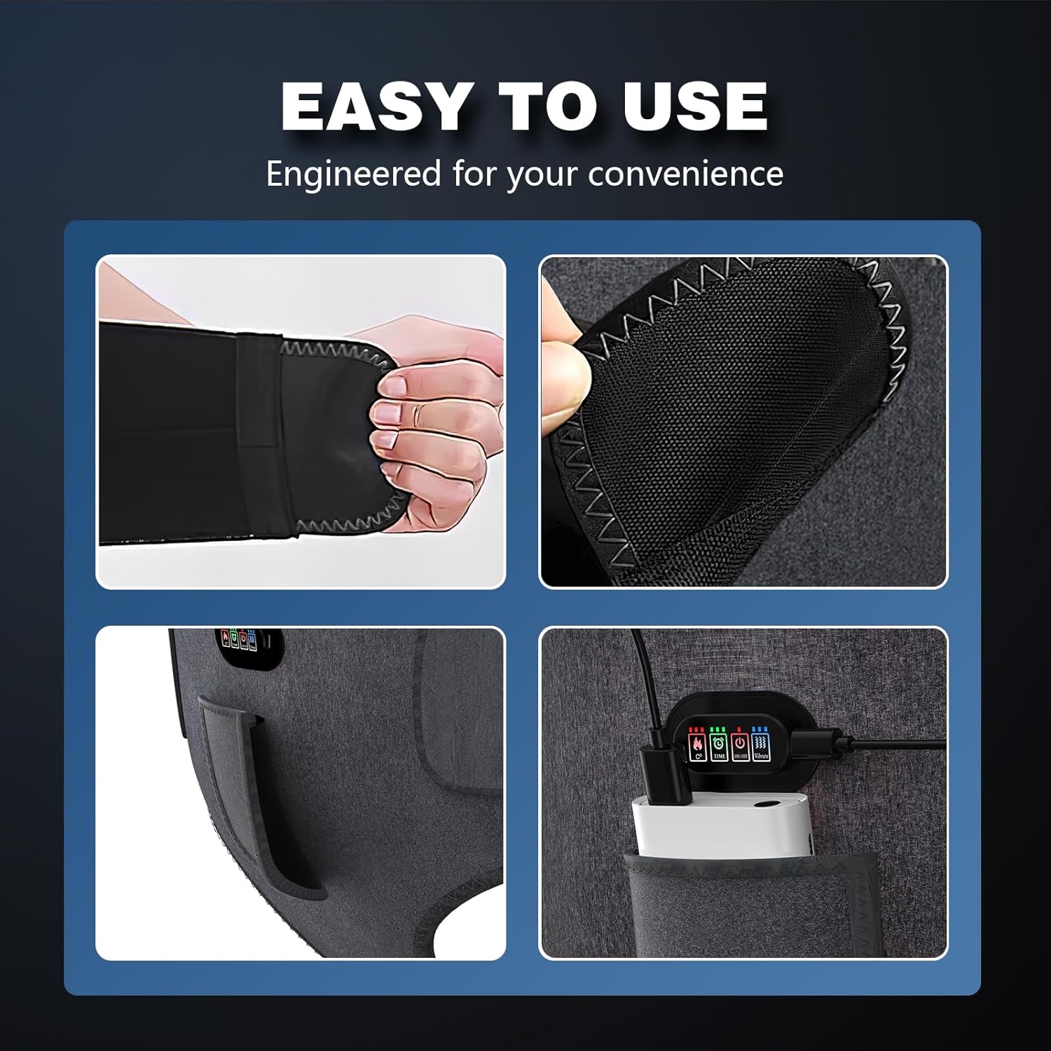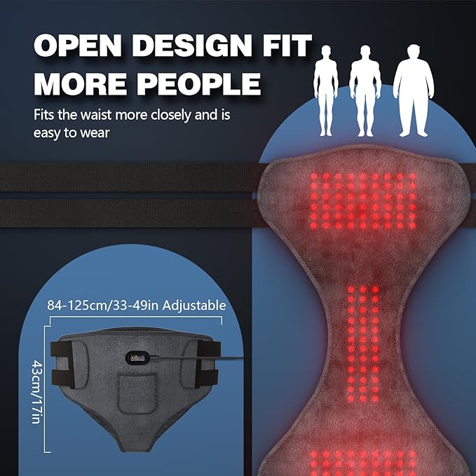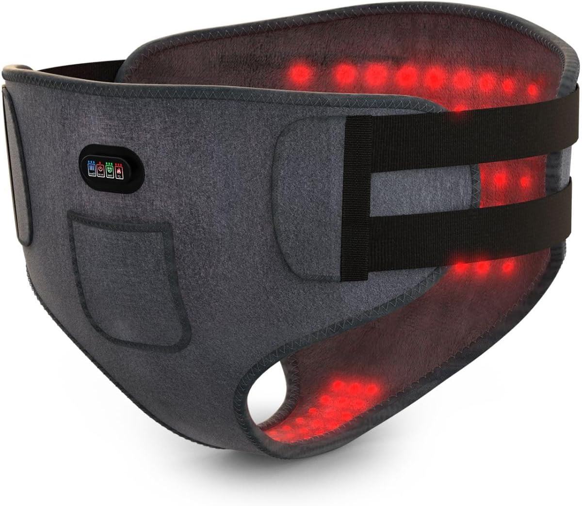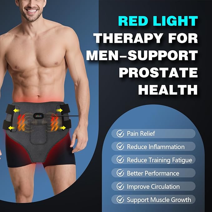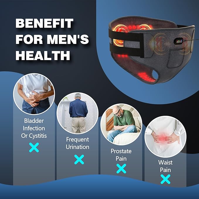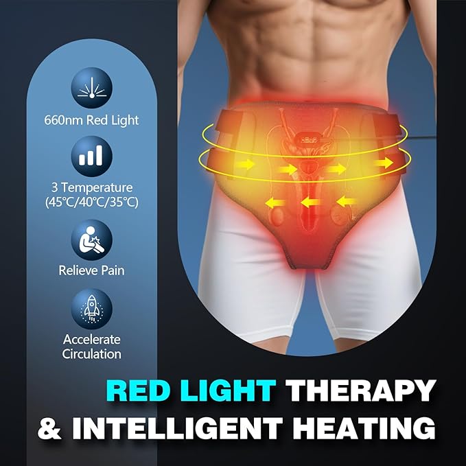 Vörös fényterápiás készülék prosztata-, derék- és hasi fájdalmakra, három hőfokozattal és kényelmes, lélegző érzettel.